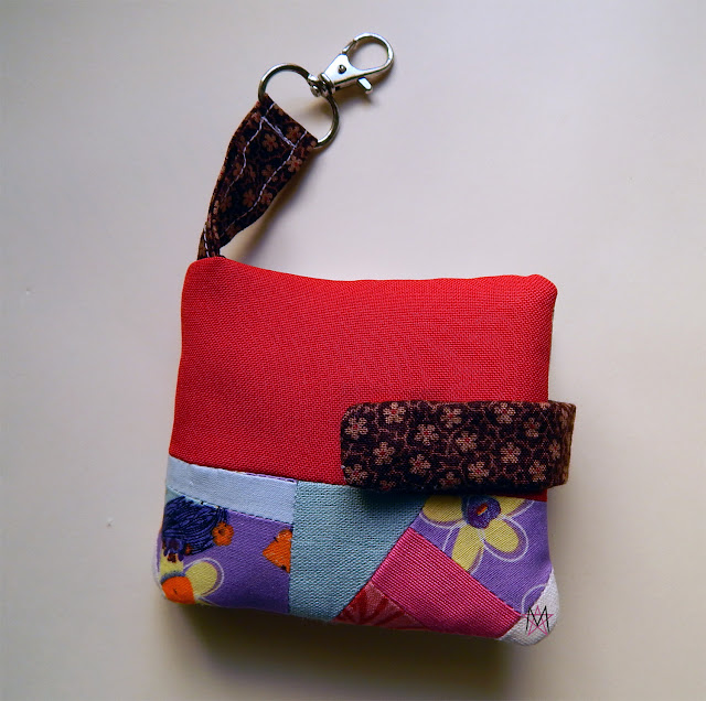 I made her this little teabag pouch which is at the same time a keyring. I used the same yellow fabric I bought to make her son's gift, the bowling set I showed here, and also a few little scraps I've had for years. I made the pattern as I sewed and it went pretty well.