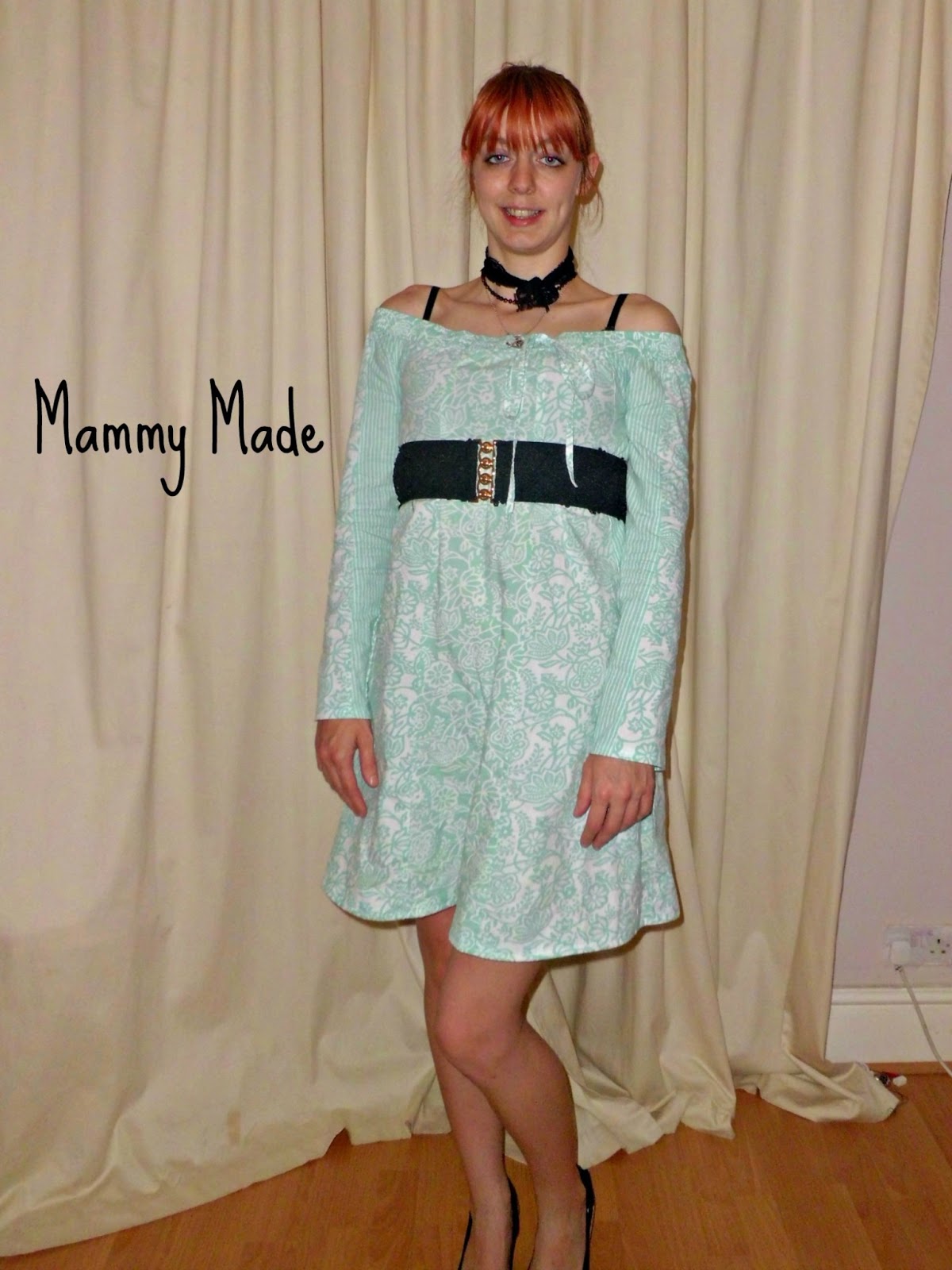 I love the fact that this dress has a drawstring around the old waistband, and thanks to the way I cut the dress, it is off centre on the front. I tied it in a bow and it added a little character to the dress. I paired it with a black belt, to make the dress less sack-like, my lace choker and my pretty black wedges. I think I look quite cute, if I say so myself!