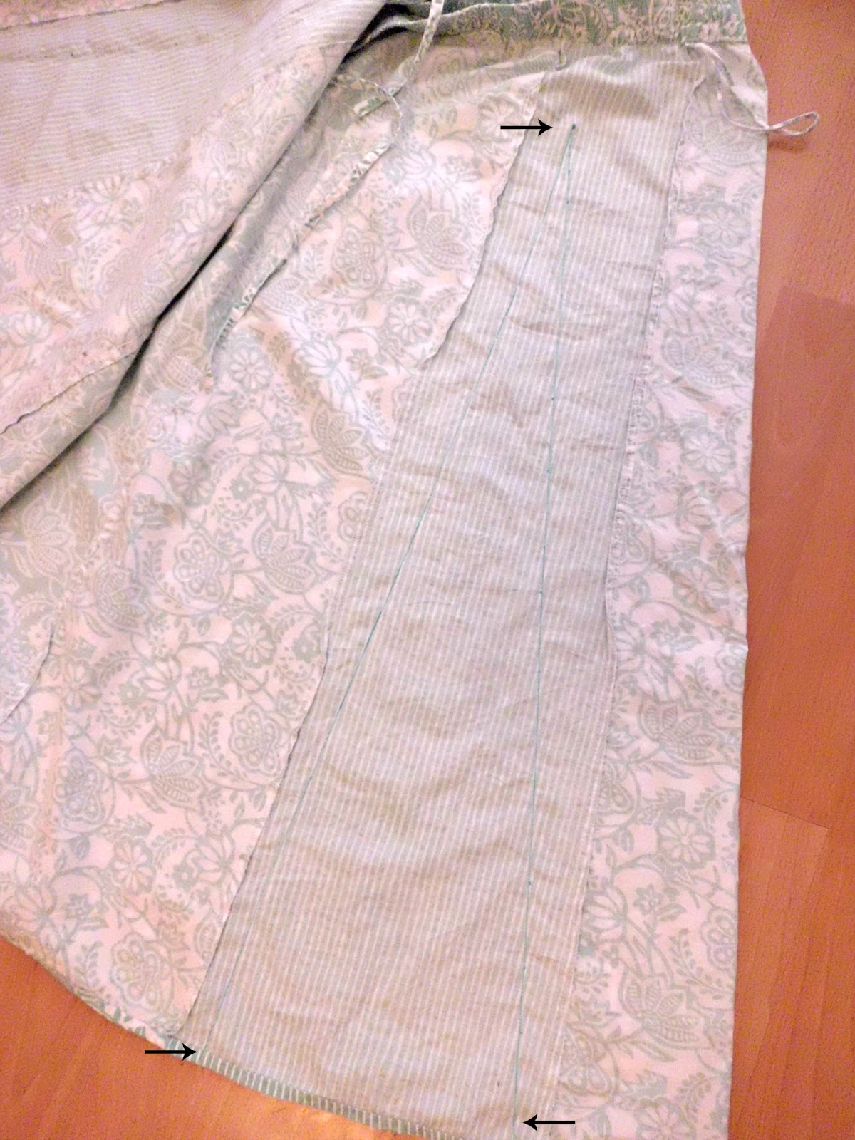 To make my new dress, I put my inside out skirt over my head, so the waistband was off shoulder. I made a mark where I wanted my armpit to be. On my skirt that ended up being 4.5" down from the waistband and 5.25" in from the side seam. I did a line of stitching running from 1/2" below the armpit mark down to the hem, 5.25" away from the side seam, in order to make my sleeve. I then repeated that on the opposite side to make my second sleeve.