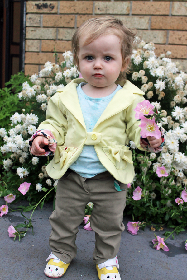 The second blazer that got to me was RaeAnna's, from Sewing Mama RaeAnna. I was so sad it didn't fit her child anymore, because she was one of the first asking and encouraging me to share this pattern. Apparently her daughter grew much more than mine in the last few months, it still fits mine and will fit for a while, but it's too small for hers. So, that's the reason why there isn't a front placket in her blazer. But it still looks adorable. Again, I love the green from the ribbon standing out of the flower print.