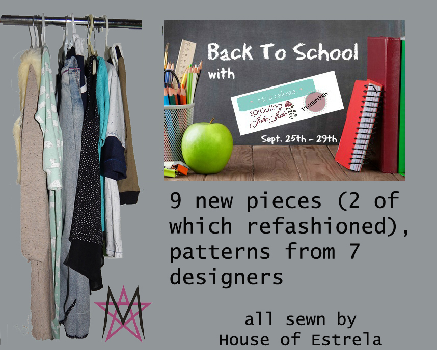 Nem acredito que posso finalmente mostrar-vos tudo o que andei a costurar nas últimas semanas. Andei a manter segredo mas estava mortinha por partilhar tudo sobre estas peças. Faço parte do Back to School (Regresso às aulas) blog tour organizado por Lulu & Celeste and Sprouting Jube Jube Productions - estas meninas são imparáveis. O tour teve o apoio de grandes designers, algumas ainda não conhecia; mas, já costurei anteriormente moldes da maioria. A sério, mostrem-lhes algum amor.