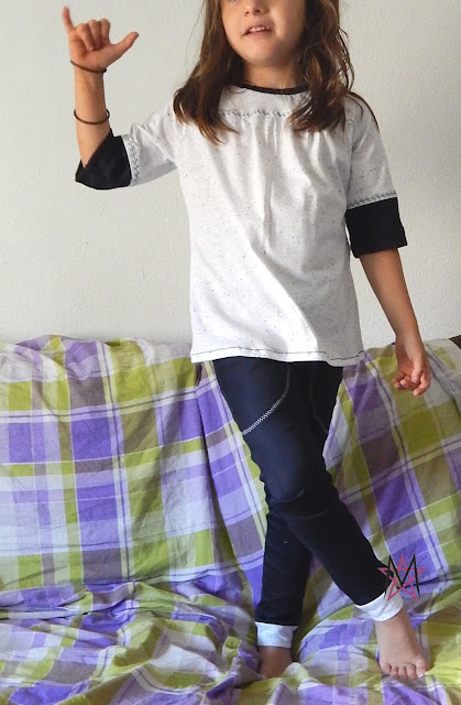 Claro que as calças estavam mesmo a pedir algo a combinar, certo? Pois bem, se no cós e tal tinha usado uns retalhos que tinha por cá (do tecido branco), para a blusa quis usar o mesmo tecido, mas já não tinha suficiente. Até que me lembrei que tinha usado o mesmo tecido para fazer um teste a um molde de blusa de mulher e que não tinha corrido bem, nem sequer estava todo acabado, assim que lá o resgatei e reciclei para ela e consegui um conjunto que combina.