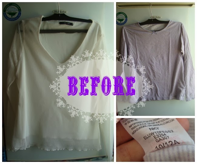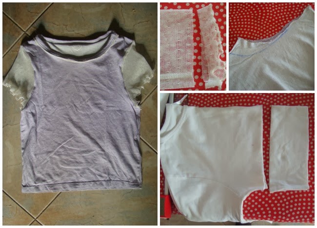 I did make an imaginary sketch of what I wanted to do and since I was lacking lace in my stash... - ok, maybe I wasn't, but for this time only I felt like go thrift shopping and I came home with 6 pieces and only spent 6€...- I bought this lace covered shirt for 1€ at a local charity shop. Then I went looking through my refashion clothes stash and found a 10/12 year size undershirt that was almost a perfect fit on me, wasn't it too short on the sleeves... did I ever mention I am a petit size?! hehe The undershirt was kept because I loved the striped purple fabric. I just couldn't let go of it.