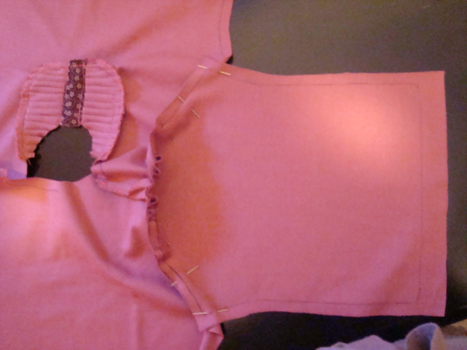 Once the hardest part of the project is done, let's get to the sleeves. Pin them like you see in the next picture, I made mine a little wider on the top so I could pucker it a little. Then sew it into place.