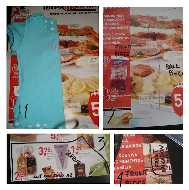 I used a slightly bigger t-shirt from my baby girl to make her new blouse. I wanted it to fit for a little longer, that's why. So, trace the front and back pattern (1). You need to adjust it to the shape you want. I made the bottoms a little larger, as seen on picture (2). Also, draw a little line on the neckline (4), down a few cms (as many as you'd like, mine has about 10cm), cut it out and save that little piece, it is a pattern too (for the neck detail). Then trace the sleeves, and add lenght (3). Use 1,50cm seams allowance to all, except the neckline and bottom of sleeves (they don't need a seam allowance), and the bottom of the blouse, you'll use a 2-3cm seam allowance here.