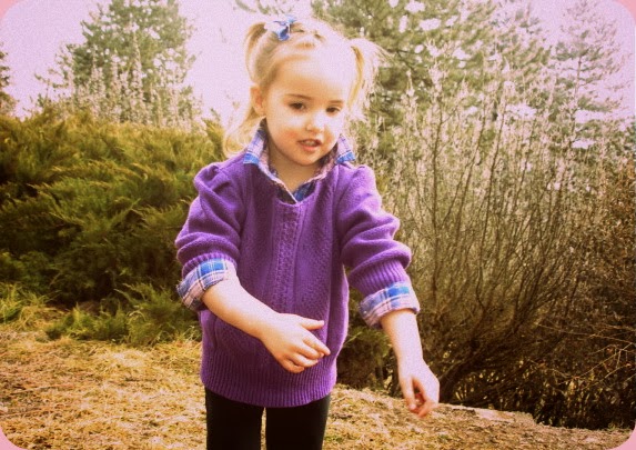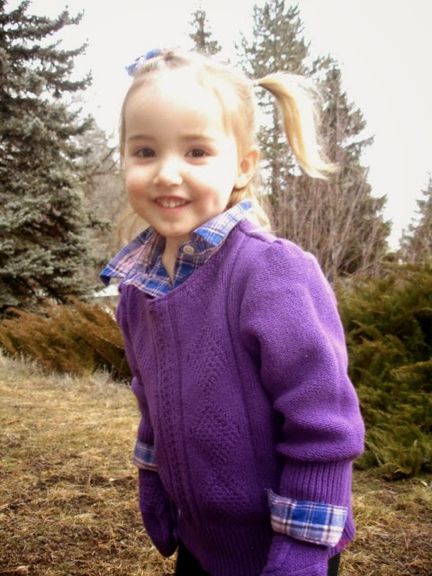 With the sleeves bunched and her collar turned up, she reminds me of Katharine Hepburn. She didn't really want to take off her mittens so I could show you though :)