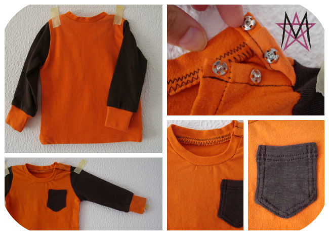To make this, I started with two before pieces. An orange woman's sized top my mom gave me not longer ago, and I've never liked but always saw potentional on it for the kids (and because I pretty much keep most of the knit pieces I come across...); and, left overs from a (bigger) kid's shirt I had cut years ago to make a waist band. Unfortunately, I didn't have enough fabric to make the collar with this brown colour as I first hoped to. I still like it in orange, so it's no big deal. What would you like better?!