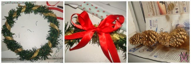 Depois, fui espreitar a minha caixa das fitas e tinha uma fita dourada que salvei há tempos de outra coisa qualquer - talvez alguma prenda que tenha recebido, e fiquei super feliz, por me aperceber que era suficiente, aliás, perfeita para a minha coroa. Fui enrolando À volta da coroa, procurando que ficasse uniforme. Dei um nó. Procurei mais um pouco e encontrei a fita vermelha, que tinha comprado para um outro projeto qualquer. Fiz um laço duplo e juntei-a à coroa, atando-a com uma fina linha (de coser) vermelha. Por fim, lembrei-me que tinha um saco cheio de pequenas pinhas que a minha rica filha apanhou o ano passado em casa da tia. Guardei-as porque, achei-as perfeitas para projetos de Natal. Como tinha comprado há pouco tinta dourada em spay, usei-a para as pinhas. Deixei secar durante a noite, mas penso que um par de horas é suficiente.
